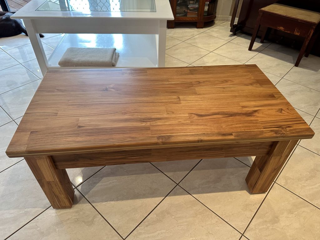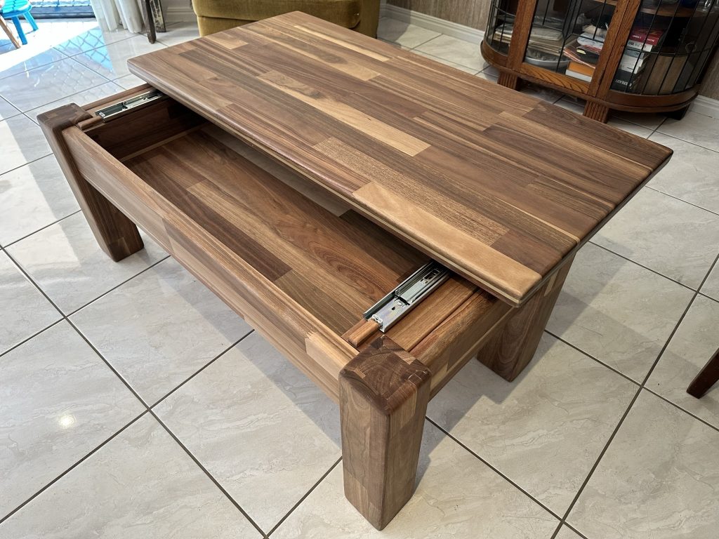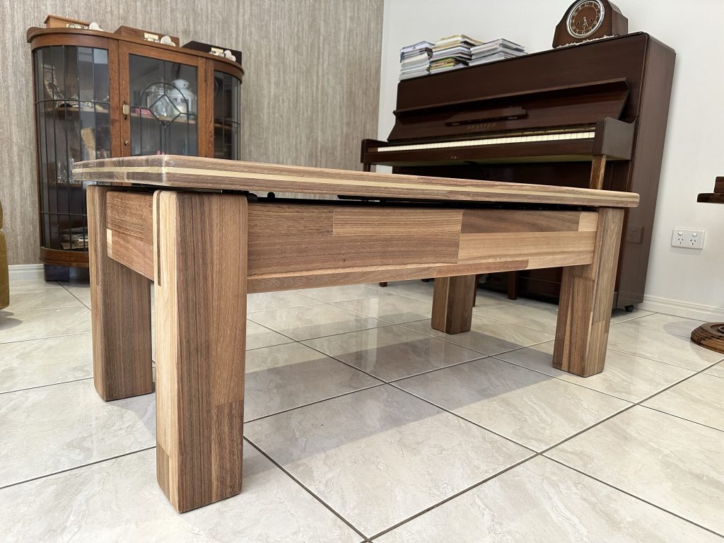 This table is made from Bluegum solid wood paneling. It measures 1200mm x 600mm with solid wood legs 100mm square. The unique feature of the table is the top surface which slides back to reveal a hidden storage compartment, ideal for your laptop or car keys.
